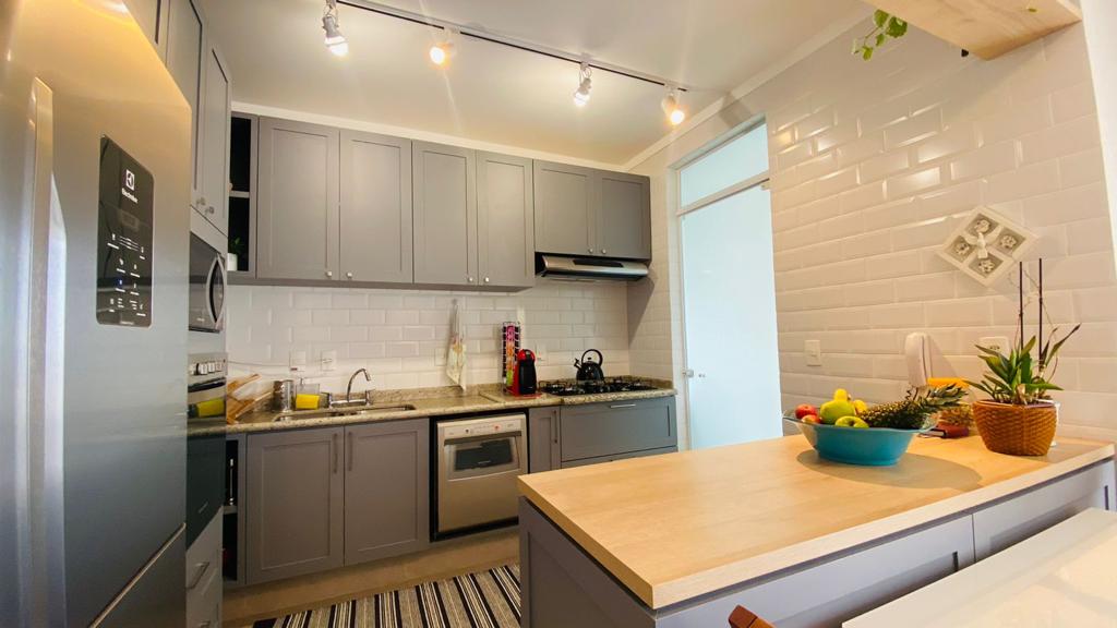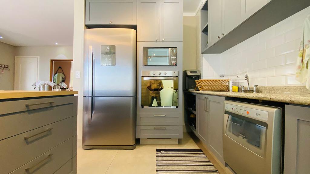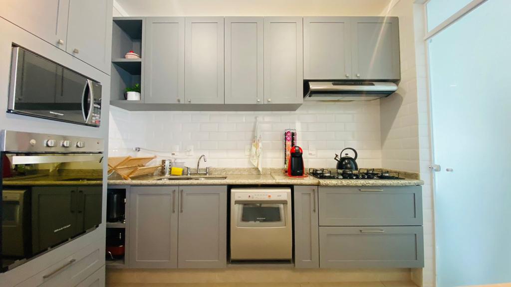 cozinha com armarios planejados, exaustor, cooktoop, forno elétrico