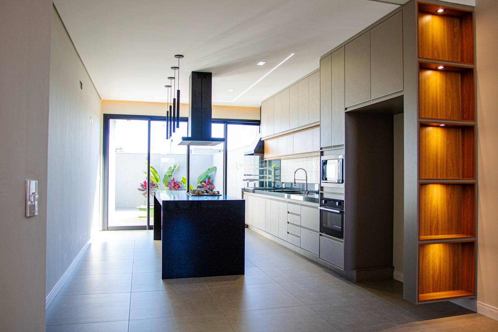 cozinha gourmet com armarios planejados, ilha com coifa e cooktop, torre quente