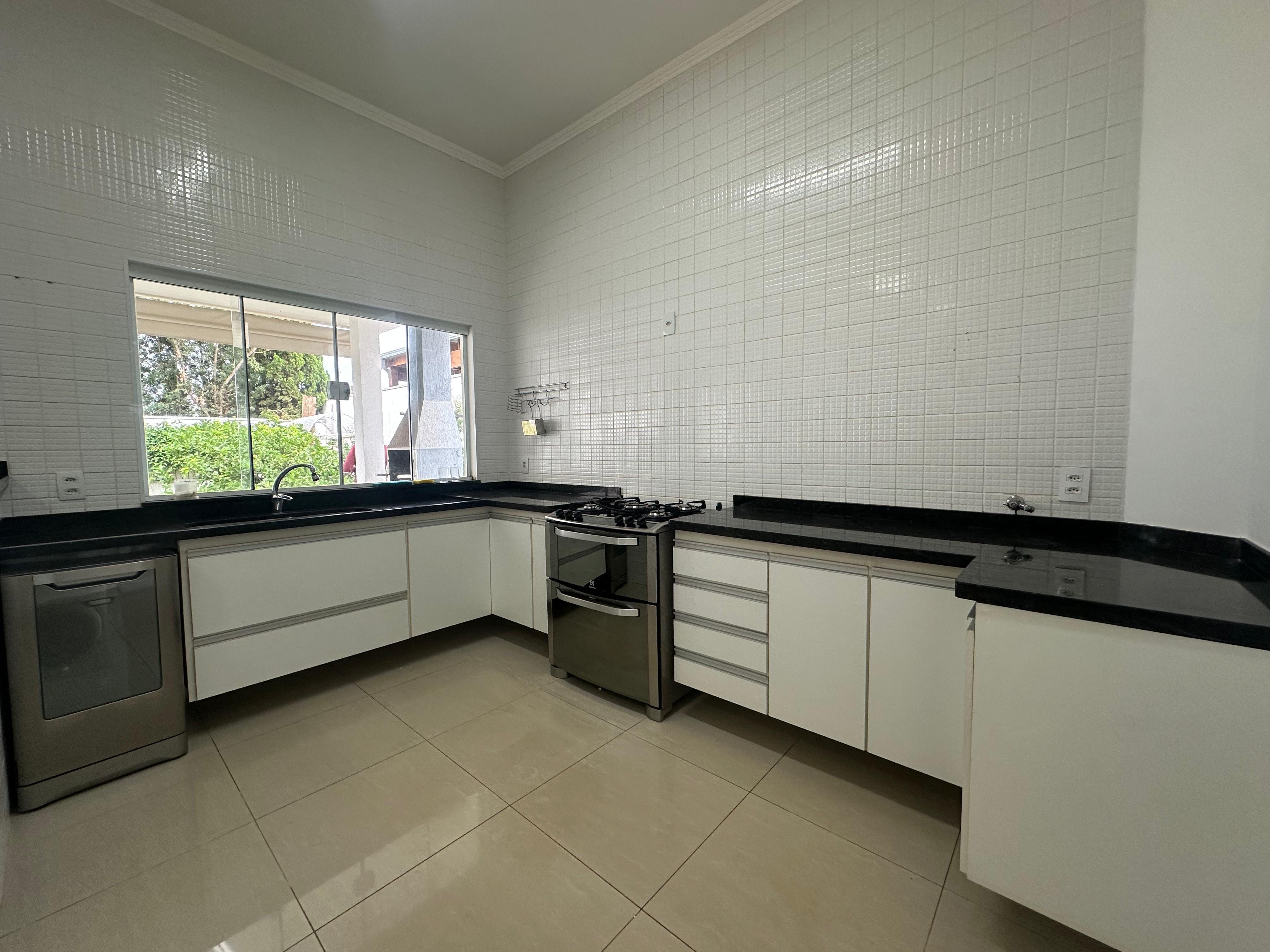 cozinha integrada com armarios planejados, fogão de 5 bocas e lava louça