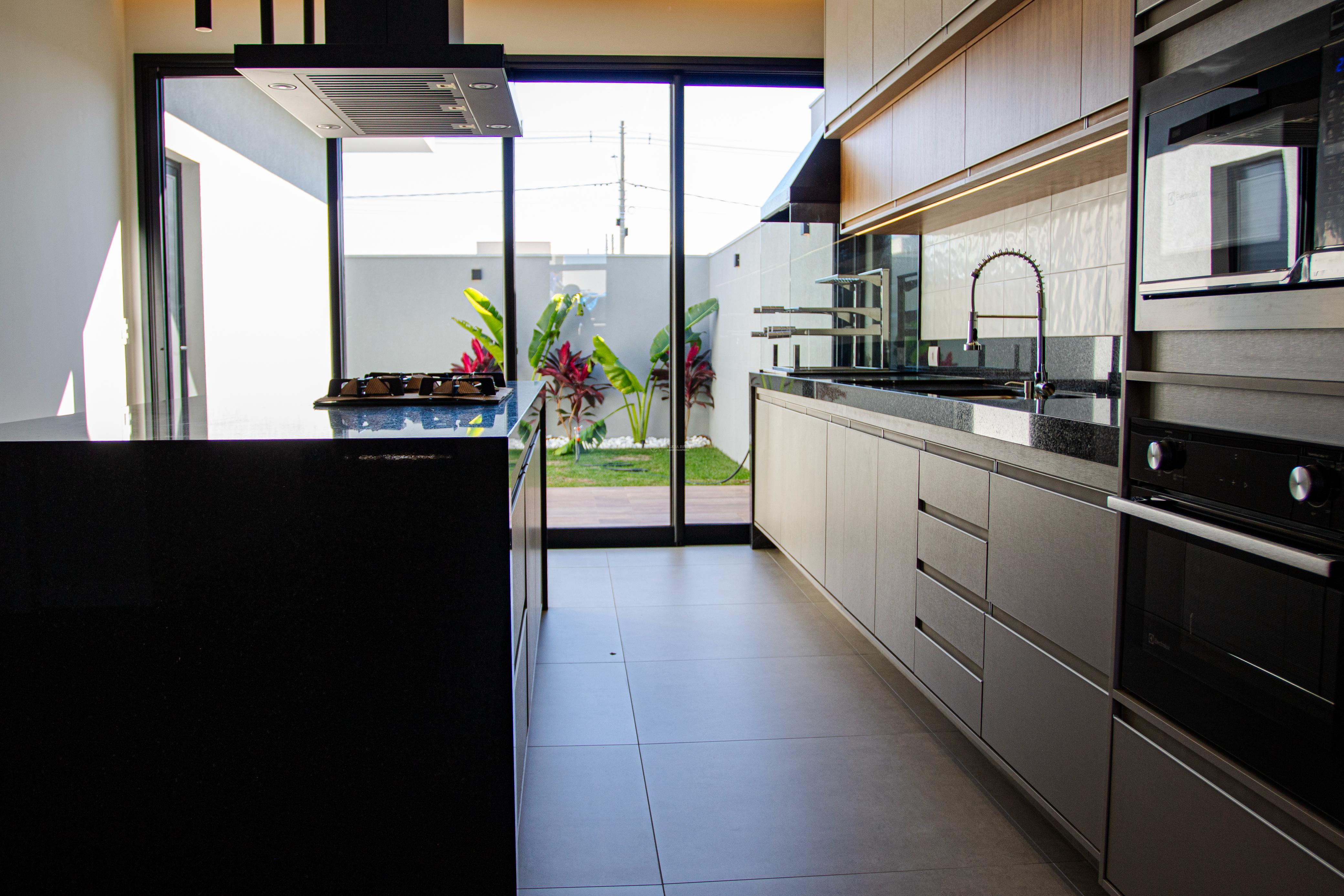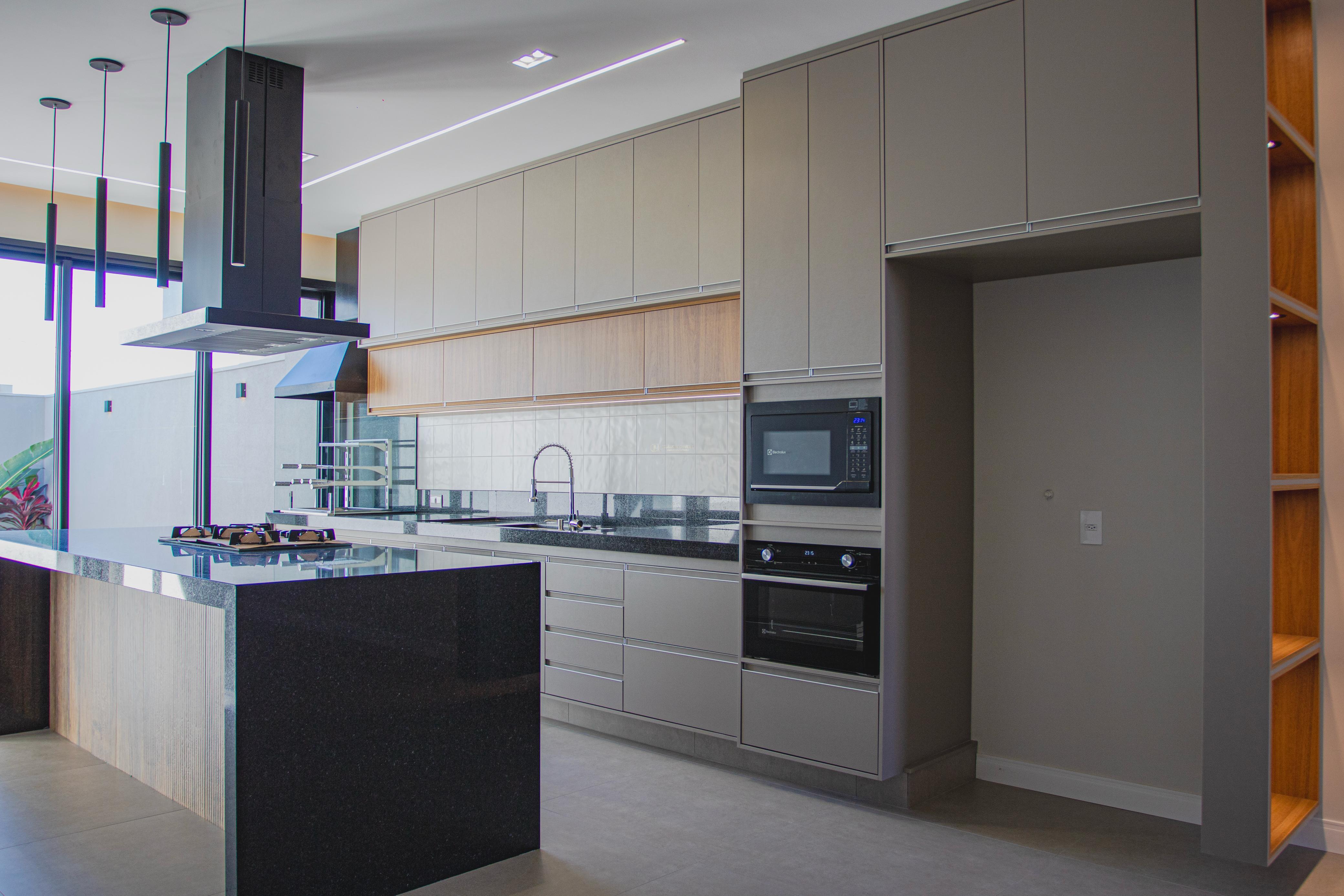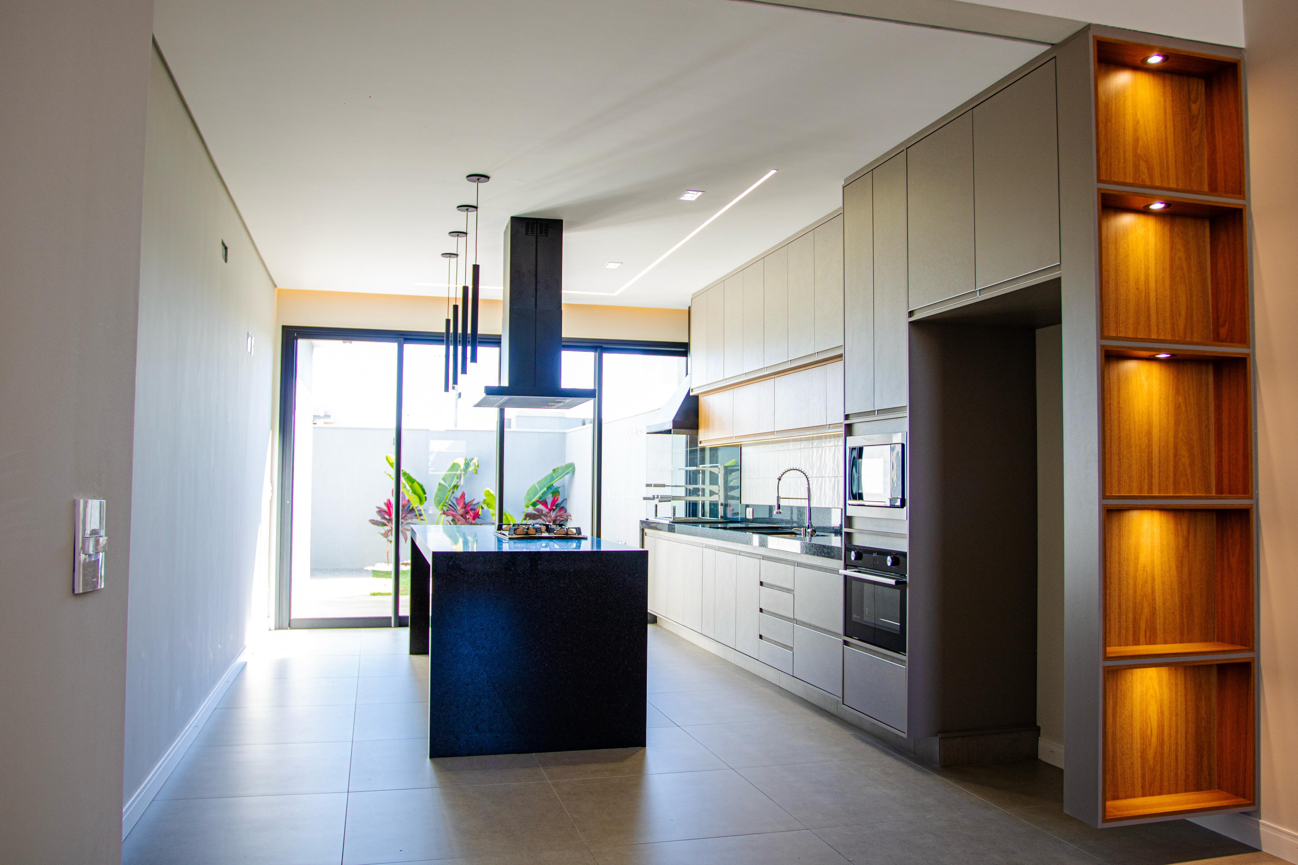 cozinha integrada com area gourmet com armarios planejados, ilha com coifa cooktop