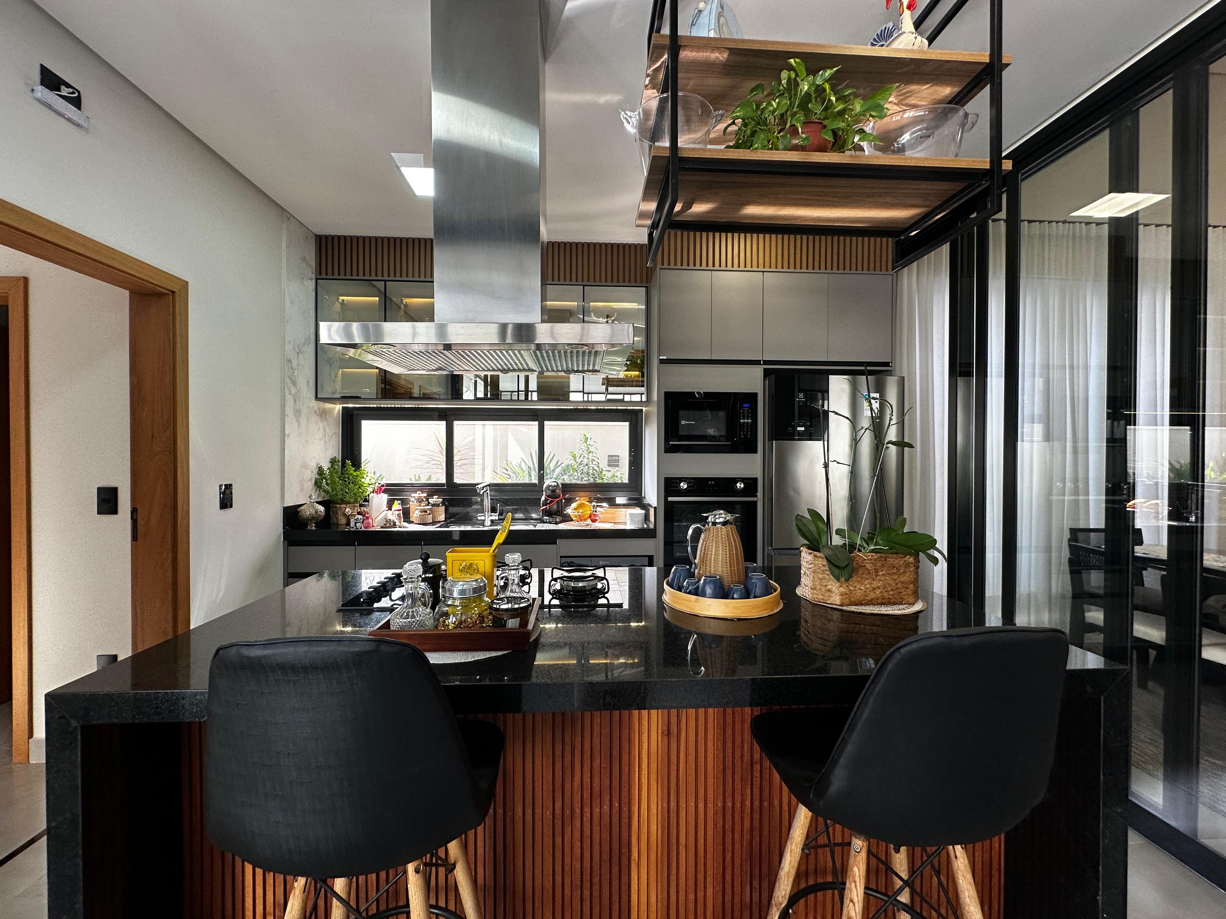cozinha com ilha coifa e cooktop, torre quente e armarios planejados